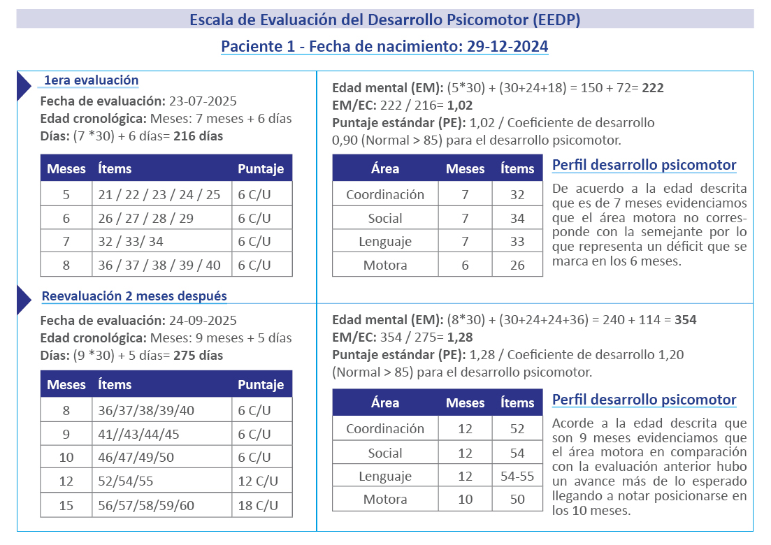 Cabe resaltar que estos pacientes conllevan un manejo multidisciplinario y bajo vigilancia desde la corrección fetal hasta su nacimiento ya que eso garantiza que la cirugía sea exitosa. Posterior al nacimiento es cuando inicia la intervención del médico especialista en Medicina Física y Rehabilitación quien realizará las evaluaciones físicas correspondientes para indicar el plan rehabilitador como la intervención temprana ajustado a las áreas de deficiencia motora y sensitiva que presente el niño. Mediante la aplicación de la Escala de Evaluación del Desarrollo Psicomotor logramos evidenciar que aunque los pacientes presentaban un coeficiente de desarrollo psicomotor normal dentro del perfil del desarrollo psicomotor exteriorizaban un déficit en el área motora por lo que al realizar la intervención con el tratamiento rehabilitador indicado desde el día de la evaluación y al cabo de un tiempo de dos meses se logró mejorar, además de avanzar por encima de la clasificación en el área donde presentaban el déficit quedando el paciente 1 en el rango de los 10 meses y el paciente 2 en el rango de los 18 meses para el área motora.