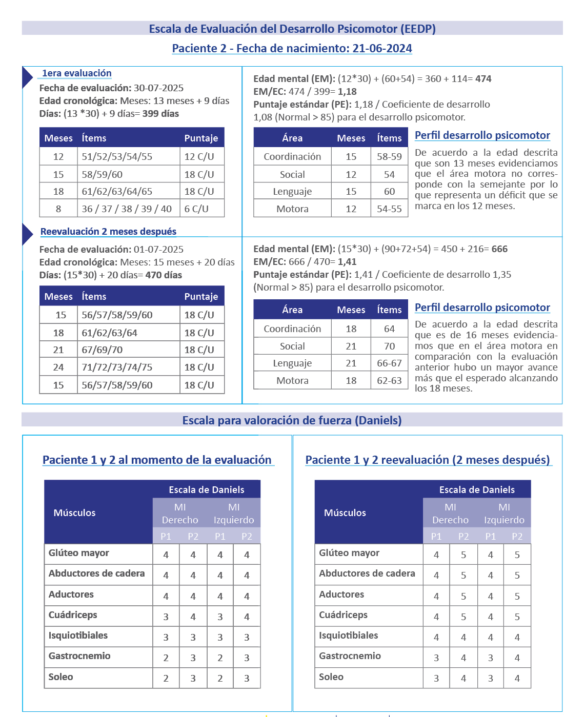 Se realizó la valoración del desarrollo de estos pacientes apli cando desde el día de la consulta y luego dos meses después la Escala de Evaluación del Desarrollo Psicomotor (EEDP). Este instrumento mide el desarrollo de niños de 0 a 24 meses para detectar retrasos o alteraciones en la motricidad, lenguaje y coordinación, donde se logró divisar en que área pre sentaban déficit del perfil psicomotor. Luego de mejorar el perfil del desarrollo psicomotor se aplicó nuevamente en la reevaluación la Escala de Daniels para valorar la fuerza mus cular de un grupo de músculos que conforman los miembros inferiores y correlacionarlo con la Escala de Clasificación Funcional del Mielomeningocele (MMFC) que nos indicara el nivel de afectación neurológica en las extremidades inferiores y la capacidad funcional para la deambulación, dependiendo la fuerza que tengan esos músculos si necesita el uso de aditamentos y el potencial de marcha que tendrá, aunque es predictiva para la deambulación específicamente a partir de los 4 años lo enfocamos en la función de los músculos que se afectan dependiendo el nivel neurosegmental de la corrección.