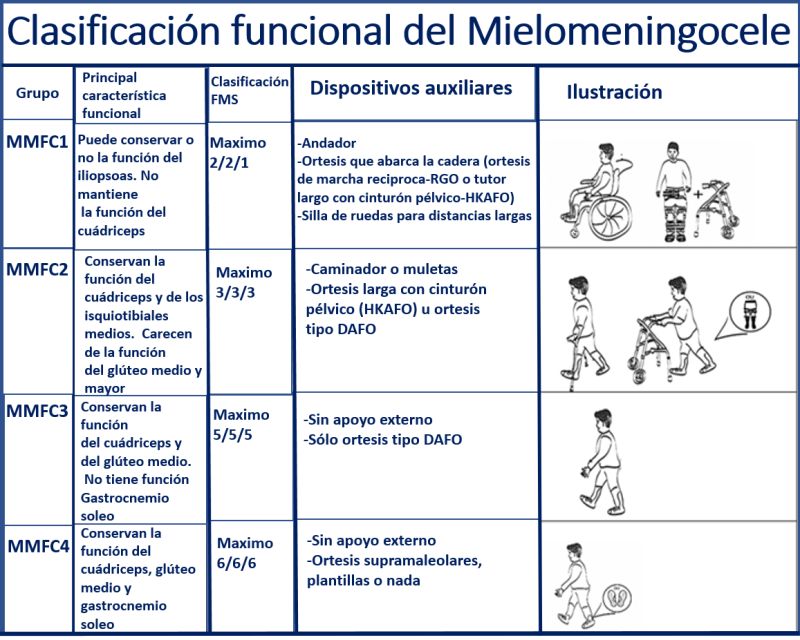 En los pacientes con esta patología, la clasificación más utilizada se basa en el nivel neurológico de la lesión: los pacientes con espina bífida torácica la característica funcional de estos es la falta de función del cuádriceps, por consiguiente para la marcha, los niños necesitan ortesis tipo HKAFO (Hip-Knee Ankle-Foot) y la mayoría de los pacientes requieren una silla de ruedas para su movilidad en la edad adulta; por su parte aquellos que presentan un nivel bajo de afectación lumbar, conservan la función del cuádriceps y los isquiotibiales me diales, pero carecen de la función del glúteo medio y glúteo mayor por lo que requieren aditamentos ortopédicos para controlar la posición del pie y el tobillo para la marcha y aquellos con afectación a nivel sacro muestran función tanto del 20 cuádriceps como del glúteo medio, sin embargo puede haber perdida de la función en alguno de los músculos que conforman el tríceps sural. (Dias LS y cols; 2021)6
