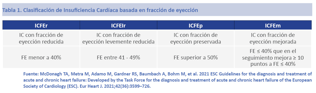 • Clase IV: Incapacidad para realizar cualquier actividad física sin síntomas; los síntomas pueden estar presentes en reposo. Para la caracterización del paciente en este caso clínico, se siguieron los criterios de las guías de la Sociedad Europea de Cardiología (E.S.C) para el diagnóstico y tratamiento de la in suficiencia cardíaca aguda y crónica (2021) basado en la clasificación de la fracción de eyección (FE); este parámetro garantiza una correlación directa con la práctica clínica habitual y con los marcos terapéuticos establecidos en los principales ensayos clínicos de insuficiencia cardíaca (10)