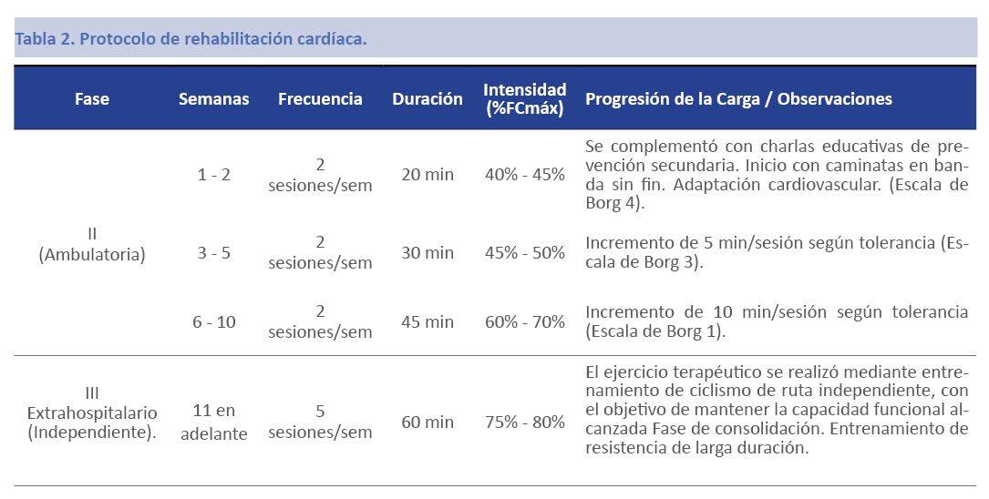 El programa aplicado correspondió a un protocolo progresivo de entrenamiento aeróbico y fortalecimiento muscular, con supervisión médica inicial, monitorización de la frecuencia cardíaca y registro sistemático de los eventos adversos. En este diseño metodológico se reconoce la ausencia de la Fase I (hospitalaria), considerándolo una limitación del estudio. Sin embargo, ello no comprometió la validez descriptiva ni la seguridad del caso.