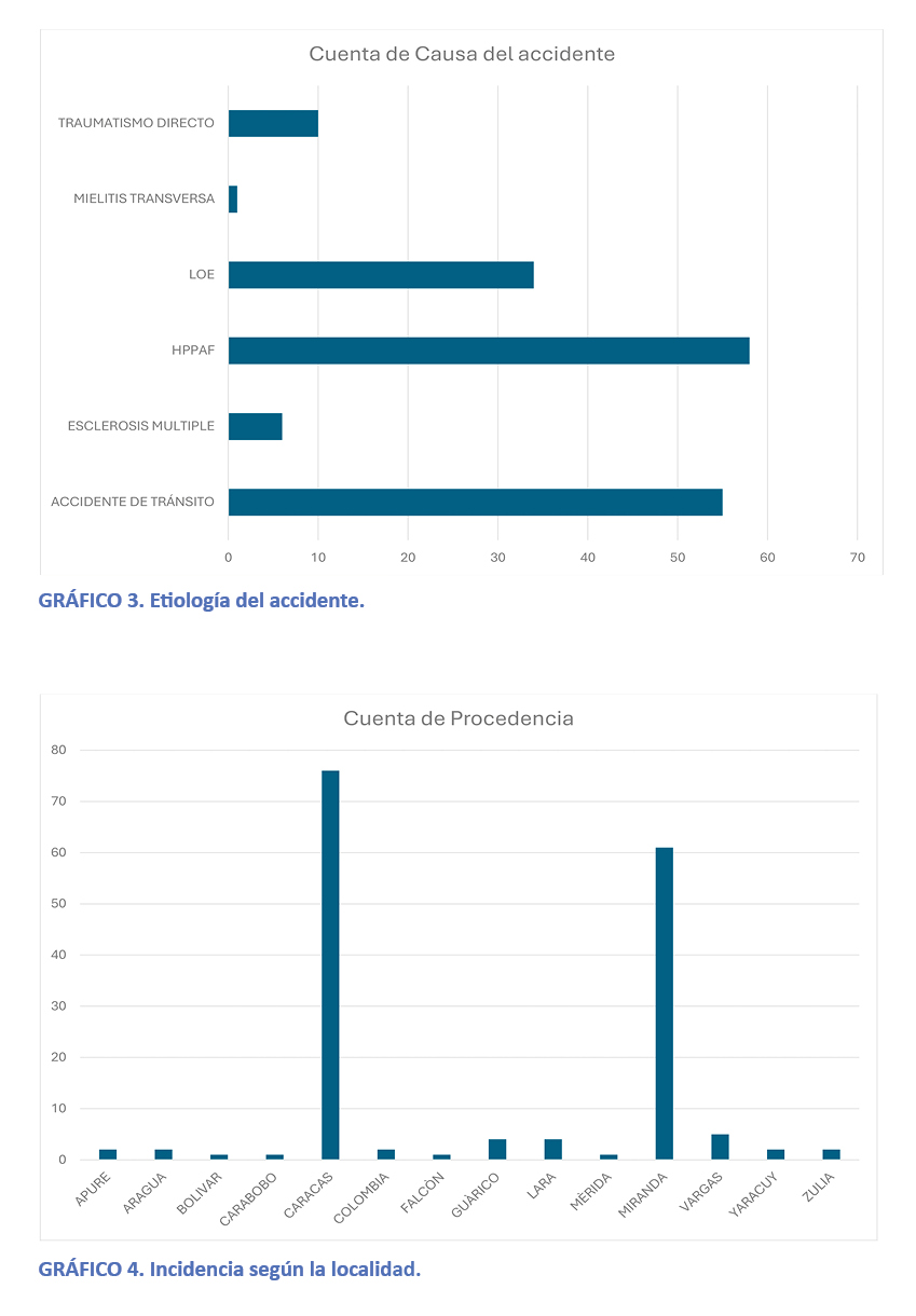 A nivel mundial, la epidemiología de la lesión medular presenta variaciones geográficas y temporales, aunque mantiene patrones consistentes. Predomina en la población adulta joven, con una mayor incidencia en el sexo masculino.³,⁶ Si bien existen causas no traumáticas, como las vasculares, infecciosas o tumorales⁹, la etiología traumática es la más prevalente. En este contexto, los accidentes de tránsito, las caídas y los actos de violencia se erigen como los principales factores desencadenantes.³ En el contexto venezolano, y particularmente en la Región Capital, la dinámica social y urbana sugiere que las causas violentas, como las heridas por proyectil de arma de fuego y los traumatismos de alta energía asociados a accidentes viales, representan una carga de morbilidad de especial relevancia⁴, configurando un perfil epidemiológico particular que requiere un análisis detallado y localizado.¹,¹⁰.
