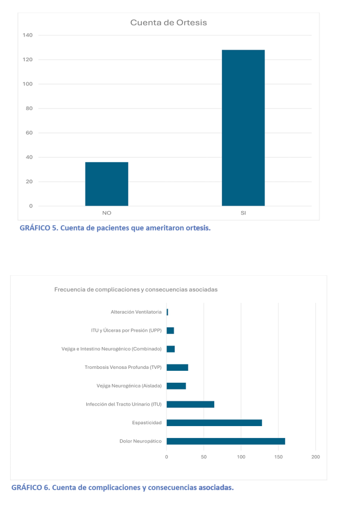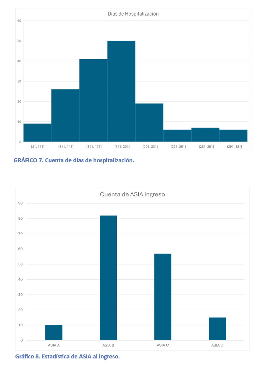 Asimismo, la estancia hospitalaria promedio de 134 días se justifica por el tiempo requerido para el neuroentrenamiento y el manejo de la alta carga de morbilidad asociada.¹,¹⁷ Las complicaciones observadas, particularmente el dolor neuropático y la espasticidad, representan los mayores obstáculos para la reinserción social¹⁸. El manejo de estas secuelas re quiere un enfoque farmacológico y terapéutico riguroso para evitar el retroceso funcional.¹⁹ Finalmente, aunque el estudio es unicéntrico, los resultados actualizan el perfil del paciente en el país¹ y cuantifican el impacto positivo de la rehabilitación especializada.⁵,²⁰